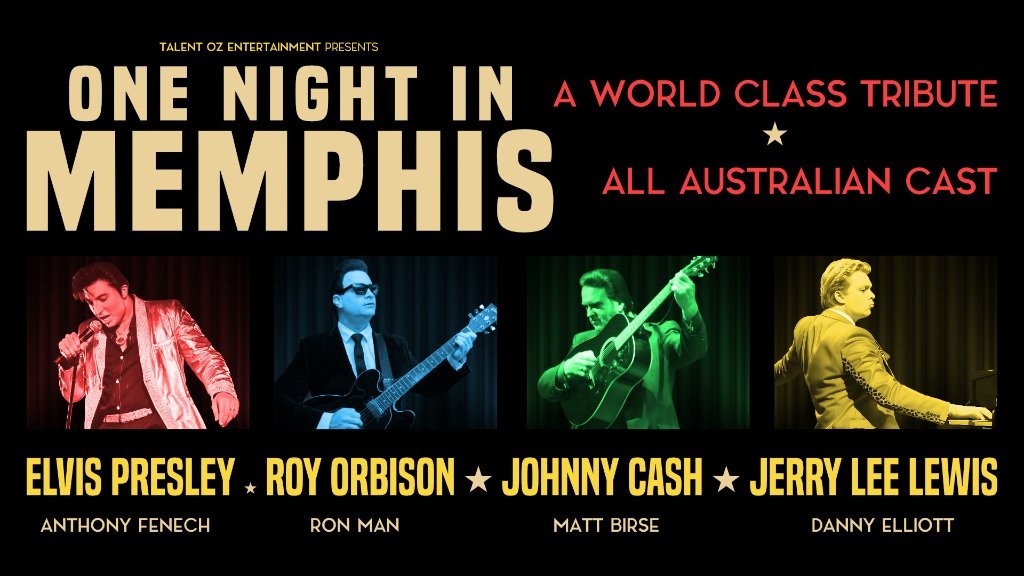 “One Night in Memphis” is the show that brings together 4 of the world’s greatest and most popular performers Elvis Presley, Jerry Lee Lewis and Johnny Cash showcasing the greatest Rock n Roll songs of the early years of the 1950s & 1960s. 2026 Also marks the 70th Anniversary of The Million Dollar Quartet getting together for an impromptu performance at Sun Studios so a special tribute will be featured in the show It has toured all over Australia to sell out performances over the last 3 years It features Four of Australia’s and Internationally renowned tribute artists together with a full 6 piece live band bringing to you over 2 hours of hit after hit from the early Memphis and Sun Records years through to some of their personal biggest songs including Elvis’s 68 comeback and early Vegas 70s.
